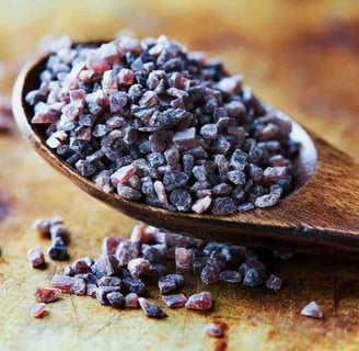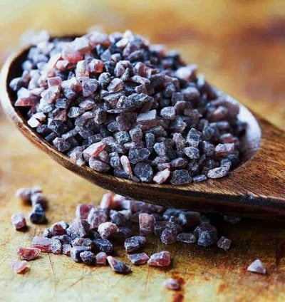 Dark, tangy, and sulfur-rich salt used in Indian chaat and Ayurvedic remedies for digestion.